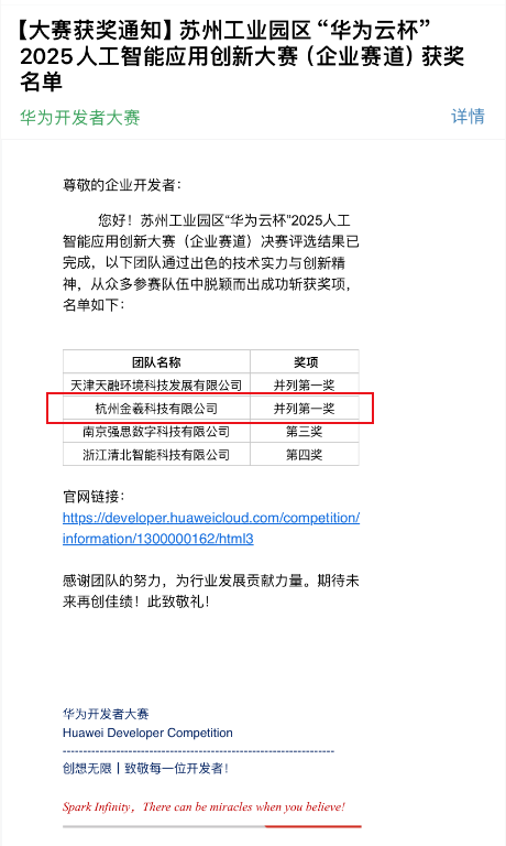 在新一轮科技革命与产业变革纵深演进、AI 成为经济高质量发展核心驱动力的背景下,“华为云杯”2025 人工智能应用创新大赛重大联合创新路演于 10 月 30 日隆重举办。我司(杭州金羲科技)凭借扎实的技术实力、优质的创新项目以及对 AI 与产业融合的深度探索,从全国 1000 家参赛企业中脱颖而出跻身决赛,经激烈角逐,成功斩获决赛第一名,全方位展现 AI 领域创新风采与领先实力。