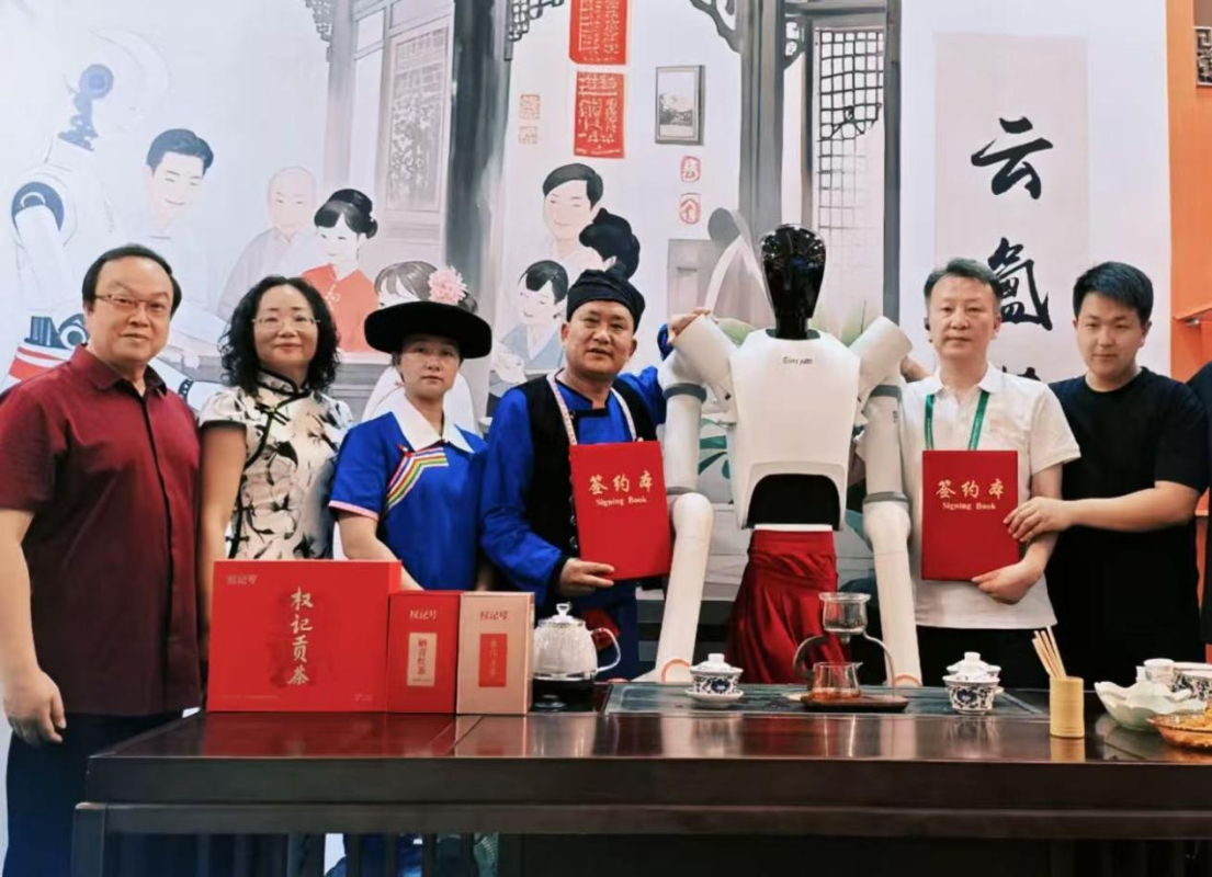 签约现场:权记贡茶国家非遗传承人-权晓辉【左四】;星眸视界总经理-胡勇【右二】;金羲科技研发总监-向浩【右一】