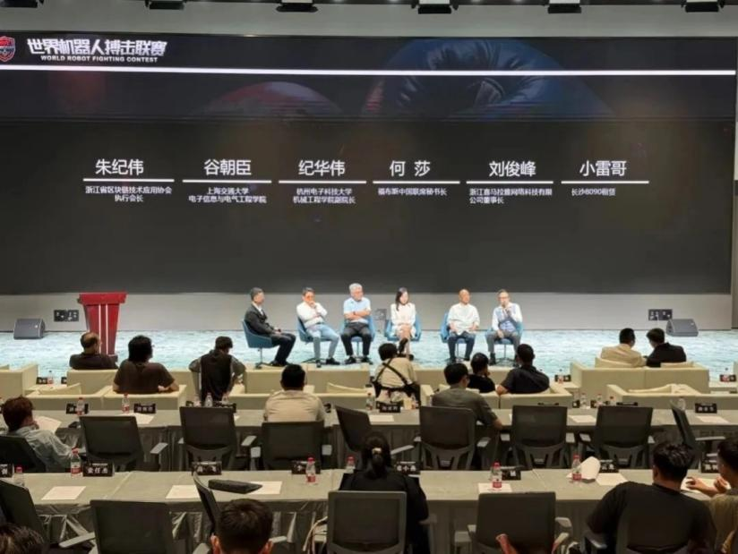 浙江省特级专家、浙江省公共政策研究院执行院长、浙江省区块链技术应用协会名誉(创始)会长金雪军,浙江省数智科技研究会会长汤勇,浙江省经信厅相关人员,浙江省可信数据研究院院长蔡亮,宇树科技联合创始人陈立,浙江大学脑机接口分院院长何钦铭,杭州电子科技大学机械学院副院长纪华伟,浙江省金融学院院长赵文阁,宁波东方理工大学副院长郭国栋,浙江省区块链技术应用协会执行会长、世界机器搏击联赛联赛主席朱纪伟 ,上海交大电子信息与电气工程学院谷朝臣,宁波大学张英,中检数智陈斌 ,浙江华为黄磊,浙江省联通公司包晓玲,科大讯飞机器人超脑中心事业部总监徐盘,同花顺副总李振科,文远知行智王文斌,国星宇航王亚波,福布斯中国联席秘书长何莎,36 创创始人蔡素卿等众多领导嘉宾出席了本次会议。众多机器人领域专家、爱好者以及相关企业代表齐聚一堂,共同见证了这一机器人竞技领域的里程碑时刻。